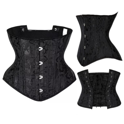 Wiązany gorset typu UNDERBUST wykonany z gęstej wytrzymałej tkaniny o dyskretnym, kwiecistym wzorze. Konstrukcja wykonana z 26 metalowych fiszbin gorsetowych.