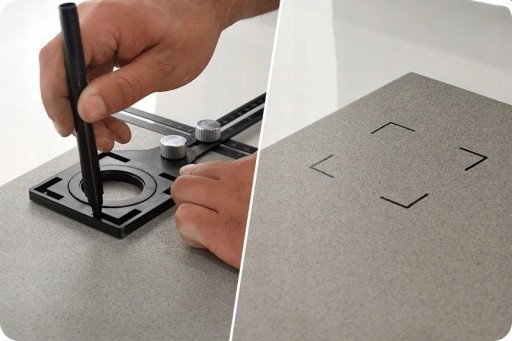 Nie muszisz już wykonywać skomplikowanych obliczeń czy odrysowywać linii i rysować na materiale niepotrzebnych linii. Wystarczy, że przyłożysz linijkę do interesującego Cie miejsca, ustawisz ramiona, a następnie w 3 sekundy oznaczysz miejsce na otwór na płytce czy innym materiale.