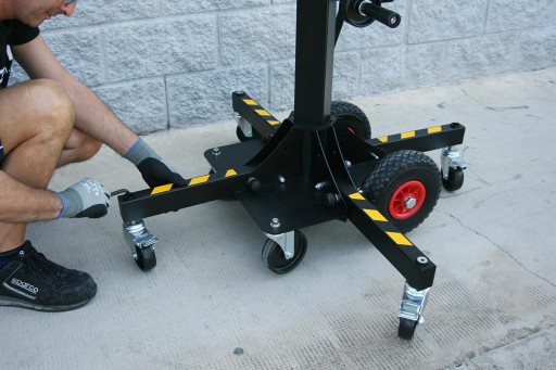 Nogi ELC-725 są wyposażone w obrotowe kółka (Ø100 mm) z hamulcami, które zabezpieczają go w pozycji roboczej, a oczka poziomujące, pozwalają na idealne dopasowanie podnośnika na każdej powierzchni, nawet na nierównym podłożu.