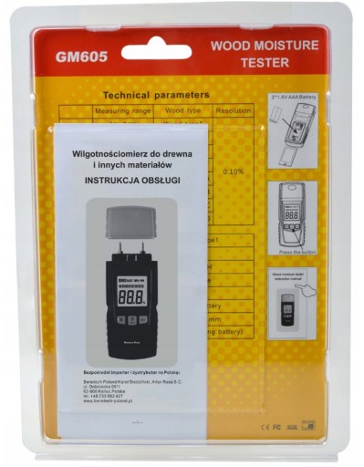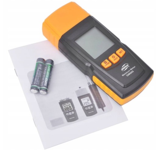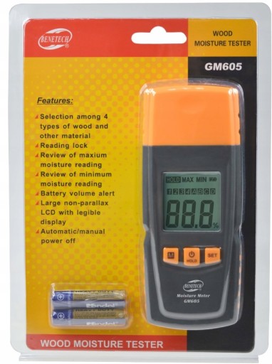 Miernik wilgotności do drewna, a także innych materiałów wykorzystujący sondy mierzące oporność do pomiaru zawartości wody. Urządzenie posiada 4 grupy do mierzenia wilgotności różnych gatunków drewna oraz 4 grupy do pomiaru wilgotności materiałów budowlanych.
