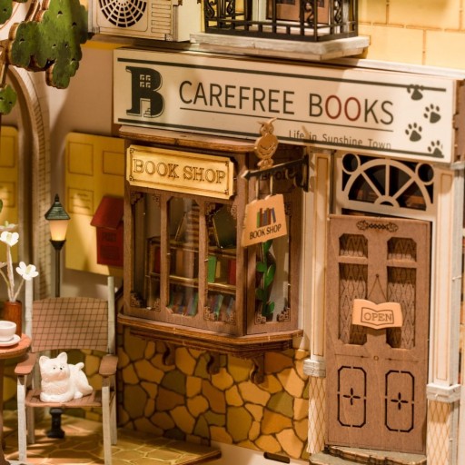Rolife 3D Sunshine Town Dom 3D zebrał ciepło i złote słońce dla swoich mieszkańców. Mały biały kot uwielbia siedzieć na krześle w księgarni, aby cieszyć się przytulnym, wygodnym popołudniem. Rośliny rosną, kwiaty śpiewają, a słońce świeci. Proszę usiąść, mój panie.
