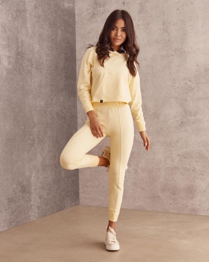 Krótka bluza kangurka z kapturem, doda niepowtarzalnego charakteru Twojej stylizacji! A wraz ze spodniami z wyższym stanem stworzy świetny zestaw. Cały dres uszyty jest z dzianiny bawełnianej.