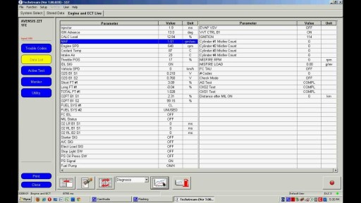 - Podgląd parametrów pracy podzespołów (LIVE DATA) z wynikami w formie wykresów. Istnieje możliwość ich zapisu na dysku, aby później móc je zanalizować (LOGI),