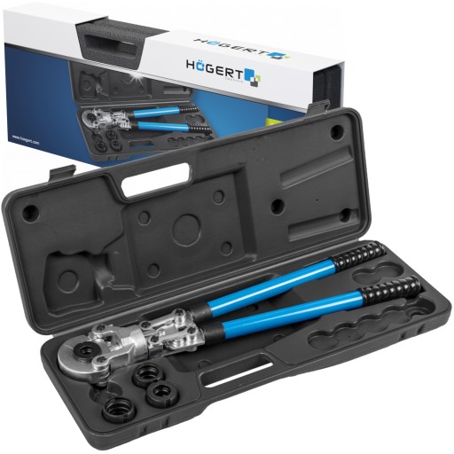 Praska hydrauliczna ręczna do zaciskania złączek na rurach PEX-AL-PEX, PERT-AL-PERT z zestawem 4 matryc. Siłownik hydrauliczny, zastosowany w zaciskarce, pozwala precyzyjnie i szczelnie zacisnąć złączki z siłą 40 kN.