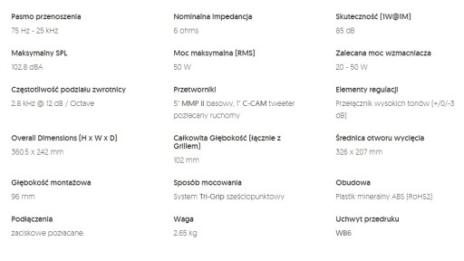 - Nasz innowacyjny system montażu Tri-Grip jest łatwiejszy w instalacji niż inne, tradycyjne rozwiązania, a głośnik znacznie szczelniej przylega do otworu w suficie co pozwala uzyskać lepszy, mocniejszy bas, oraz czystszą średnicę.