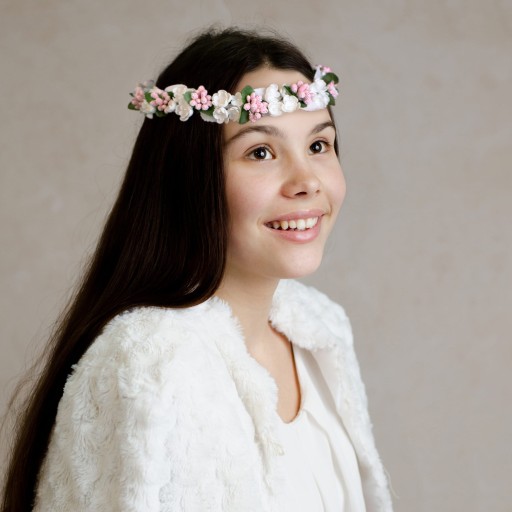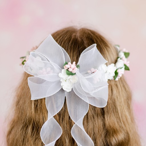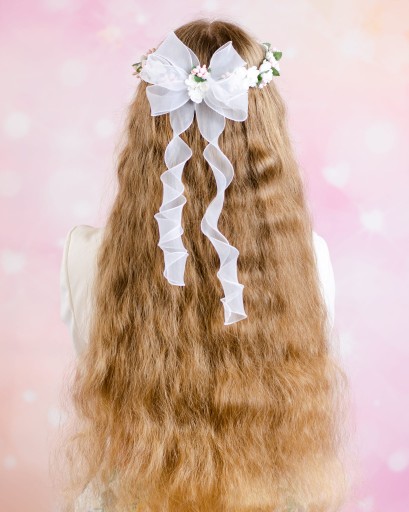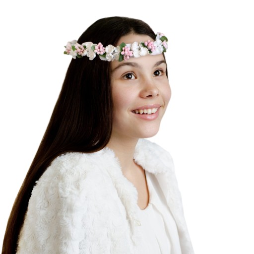 Piękny wianek komunijny wykonany z piankowych, białych kwiatuszków, udekorowanych drobnymi perełkami. Dodatkowo posiada różowy i zielony, roślinny akcent, który nadaje mu bardzo naturalny wygląd. Z tyłu tiulowa kokarda przyozdobiona kwiatuszkami. W dół odchodzą półprzezroczyste tasiemki, które pięknie prezentują się na włosach. Ciekawy wianuszek, który będzie stanowił idealny dodatek w dniu Pierwszej Komunii Świętej. Pięknie prezentuje się zarówno na rozpuszczonych, jak i na spiętych włosach.