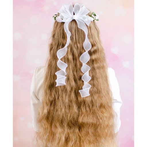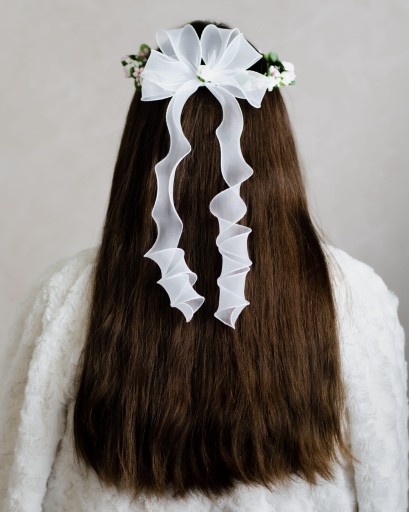 Piękny wianek komunijny wykonany z piankowych różowych i białych różyczek. Dodatkowo posiada delikatny zielony akcent, który nadaje mu bardzo naturalny wygląd. Z tyły półprzezroczysta kokarda, również udekorowana różyczką. Od kokardy w dół odchodzą tiulowe tasiemki, które pięknie prezentują się na włosach. Delikatny wianuszek będzie stanowił idealny dodatek w dniu Pierwszej Komunii Świętej. Pięknie prezentuje się zarówno na rozpuszczonych, jak i na spiętych włosach.