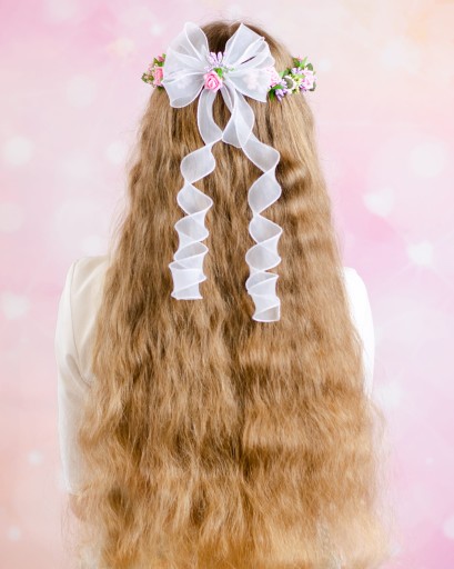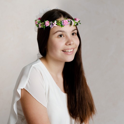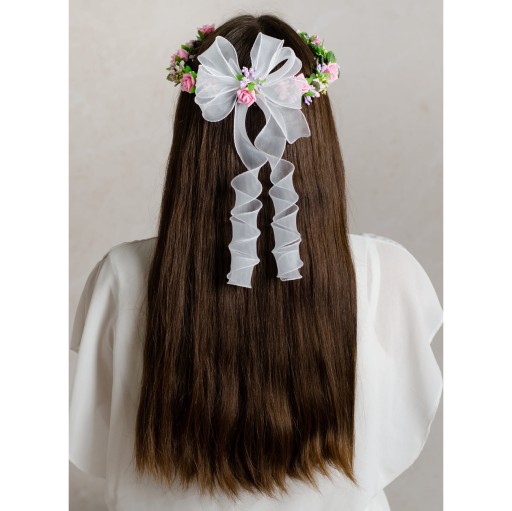 Piękny wianek komunijny wykonany z piankowych, różowych różyczek. Wykończony zieloną wstążeczką dzięki czemu wygląda jak żywy. Dodatkowo posiada pudrowe oraz wrzosowe akcenty roślinne. Z tyłu piękna, biała kokarda, udekorowana różyczką. W dół odchodzą tiulowe wstążeczki, które pięknie prezentują się na włosach. Ciekawy wianuszek, który będzie stanowił idealny dodatek w dniu Pierwszej Komunii Świętej. Pięknie prezentuje się zarówno na rozpuszczonych, jak i na spiętych włosach.