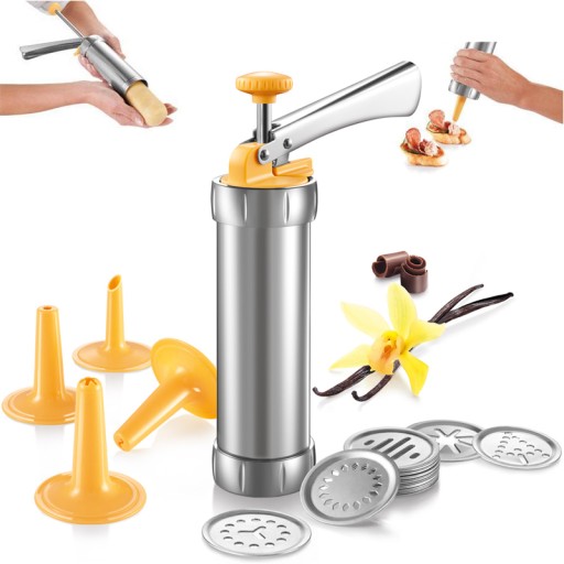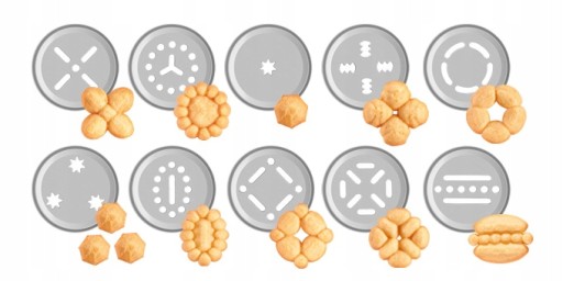 - Zestaw zawiera 20 krążków wyciskających, 4 dysze do dekorowania oraz dozowniki do małych i dużych ciastek.