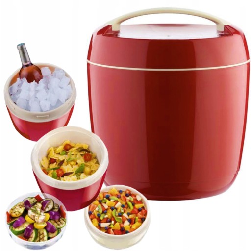 (sprzedawany z termoboxami 2,5 oraz 3,5 l). Pojemnik został wykonany z wysokiej jakości wytrzymałego plastiku. Pojemnik z wieczkiem można myć w zmywarce, natomiast termoboxu nie należy myć w zmywarce.