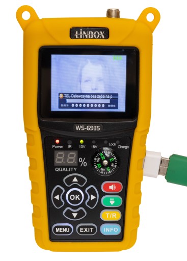 Miernik sygnału satelitarnego firmy Linbox model WS-6935 z kolorowym wyświetlaczem LCD oraz wbudowanym zasilaniem.