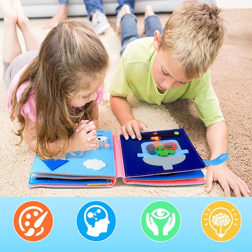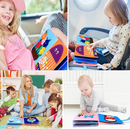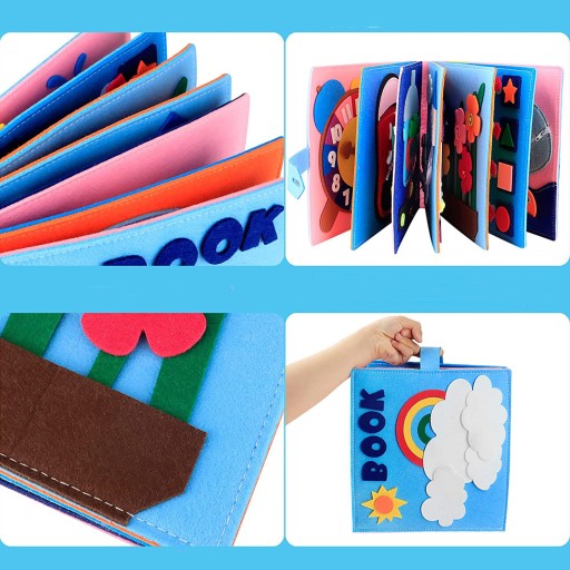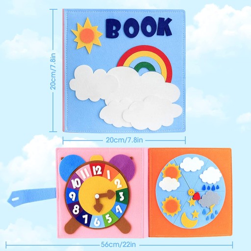 - Filcowa książeczka malucha ma wiele aktywności, takich jak kręcenie rączek, wiązanie sznurowadeł, zegar, pogoda, hipopotam mycie zębów, płytka dociskowa, kolorowe puzzle, gry domowe, ciągnięcie rzodkiewek, a aktywność naklejki sensoryczne można wklejać w określonych pozycjach lub dowolnie nimi grać .