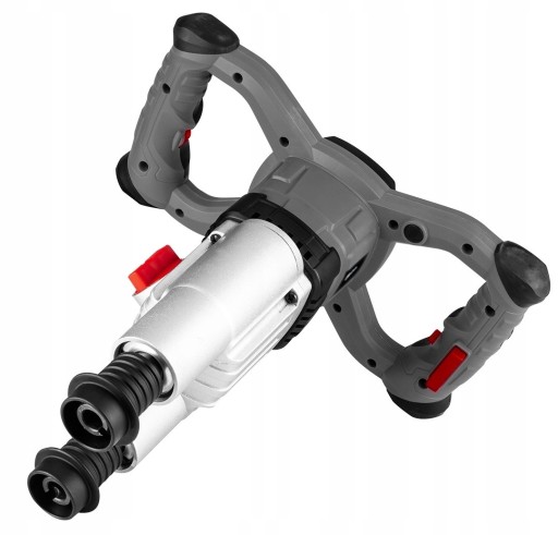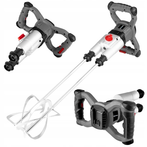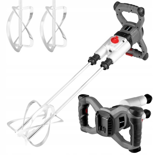 Posiada mocowanie dwóch mieszadeł, co znacznie przyczynia się na większą efektowność oraz osiąganie szybszych wyników pracy. Ergonomiczne, samozaciskowe uchwyty zapewniają stabilną pozycję podczas użytkowania mieszarki. Urządzenie jest dobrze wyważone i wzbogacone włącznikiem z zabezpieczeniem, który dodatkowo chroni przed przypadkowym uruchomieniem mieszarki. Do zestawu dołączane są dwa mieszadła.