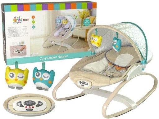 Leżaczek posiada regulacje zmiany pozycji. Cały bujaczek jest wyłożony przyjemnym, pluszowym w dotyku materiałem. Za ochronę przed słońcem, bądź aby zmienić kąt nachylenia zawieszek na górze odpowiada zamontowany daszek. Miękkie podparcie głowy polepsza komfort snu maluszka. Zawieszki pluszowe w kształcie ptaszków z pewnością przyciągną uwagę dziecka, zachęcając do treningu rączek.