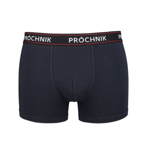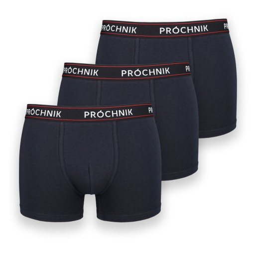 Zestaw męskiej bielizny, zawiera trzy sztuki gładkich bokserek marki Próchnik w kolorze granatowym. Bielizna sprawdzi się zarówno pod elegancką odzież, jak i ubrania casualowe, a nawet na siłownie lub do uprawiania sportów - wszystko dzięki wygodnemu krojowi i dodatkowi elastanu.