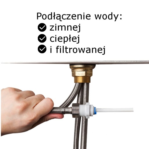 - W zestawie wszystkie elementy potrzebne do zamontowania (kran, uszczelki, elastyczne wężyki zbrojone do podłączenia ciepłej, zimnej i filtrowanej wody, rozeta, złączka do podłączenia wężyka filtra wody)