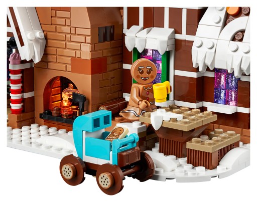 - Chatka z piernika ma oszroniony dach z kolorowymi guzikami cukierków, zdobiony front z kolumnami jak cukierki-laseczki, lśniące okna i wysoki komin. W pełnym detali wnętrzu znajdziesz kominek, a w zestawie jest dodatkowo wózek i odśnieżarka z klocków.