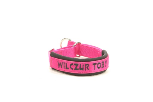 - Treść haftu i czcionka (lub przykładowa obroża). W cenie zawarty jest dowolny napis mieszczący się na obroży,
