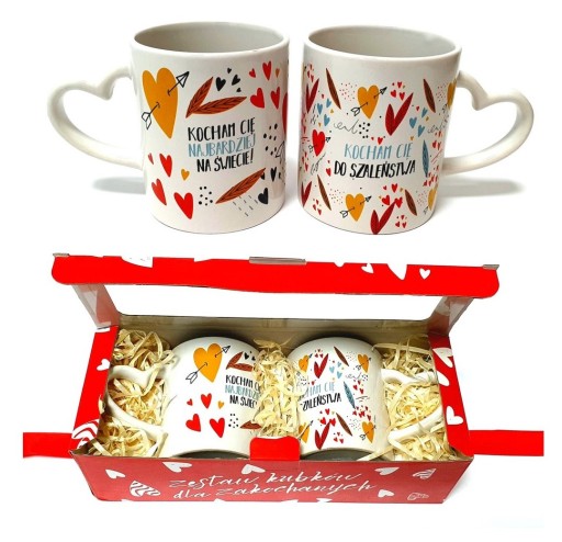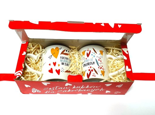 Napis na kubkach - "Kocham Cię najbardziej na świecie" oraz "Kocham Cię do szaleństwa".