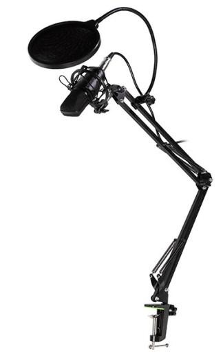 - Statyw –Bezpiecznie i stabilnie bez huśtania się. Konstrukcja stalowa z podwójnym ramieniem. Maksymalna obciążalność 2,5 kg, długość ramion 40 cm. Wyposażony w gwint 6,25 mm (5/8”), pasuje też do mikrofonów Blue Yeti, Blue Snowball.