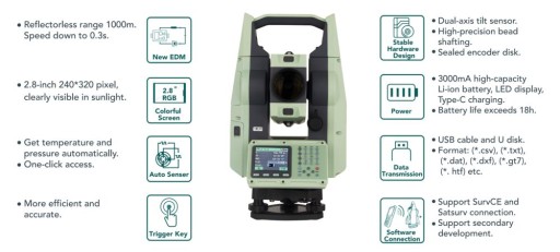 Instrument wyróżnia też nowy, jaśniejszy kolorowy ekran. Tachimetr został wyposażony w 2,8-calowy wyświetlacz o dużo wyższej jasności w świetle dziennym.