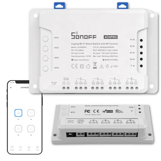 Sonoff 4CH PRO R3 to inteligentny przełącznik sterujący czterema podłączonymi urządzeniami. Sterowanie odbywa się za pomocą aplikacji eWeLink na telefon, tablet lub smart TV, pilota RF 433 MHz oraz przycisków. Sonoff 4CH PRO R3 pozwala na zaprogramowanie czynności wykonywanych przez przełącznik w określonym czasie. Programowanie czasowe odbywa się w sposób jednokrotny, powtarzanie, odliczanie czasu, ustawienie określonego czasu włączania/wyłączania. Może też działać jako zdalny włącznik/wyłącznik on/off. Współpracuje z inteligentnymi urządzeniami jak Amazon Alexa i Google Home, co po sparowaniu pozwala na uruchamianie przełącznika za pomocą komend głosowych. Przełącznik można zastosować do wszystkich urządzeń zasilanych z gniazdka. Aplikacja eWeLink pozwala na obsługę wszystkich przełączników zainstalowanych w domu i podłączonych do różnych urządzeń. Każde urządzenie może zostać nazwane indywidualnie, co ułatwia sterowanie. W ofercie posiadamy Switche jednokanałowe oraz wielokanałowe, które obsługują kilka urządzeń oraz akcesoria Sonoff.