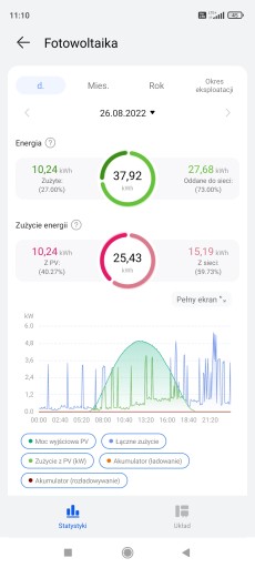 - Pełne monitorowanie produkcji i zużycia energii: aplikacja FusionSolar wyświetla nie tylko informacje o produkcji energii z fotowoltaiki, ale również o zużyciu, podzielonym na energię z paneli słonecznych i z sieci.