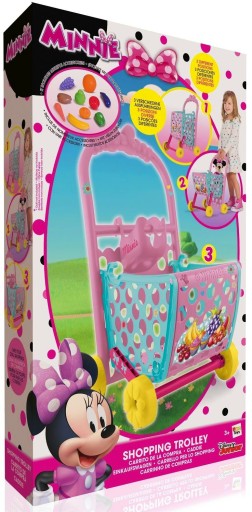 Wózek posiada stabilną konstrukcję, 4 kółka przypominające kwiatuszki, wygodny uchwyt dopasowany do wielkości rączek dziecka oraz siedzisko, w które można umieścić ulubioną maskotkę Myszkę Minnie lub lalkę.