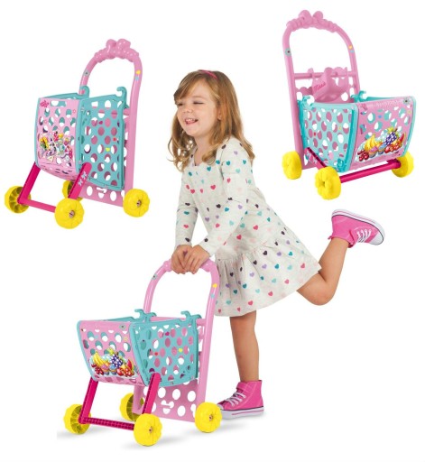 Wózek sklepowy jest w uroczej kolorystyce, w której dominuje delikatny jasny róż oraz kolor miętowy.