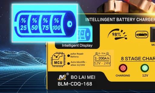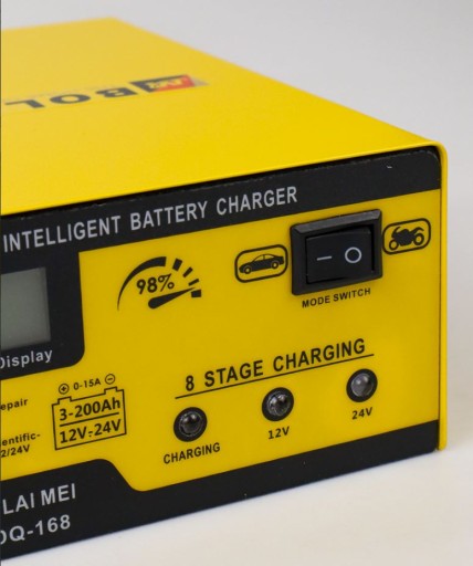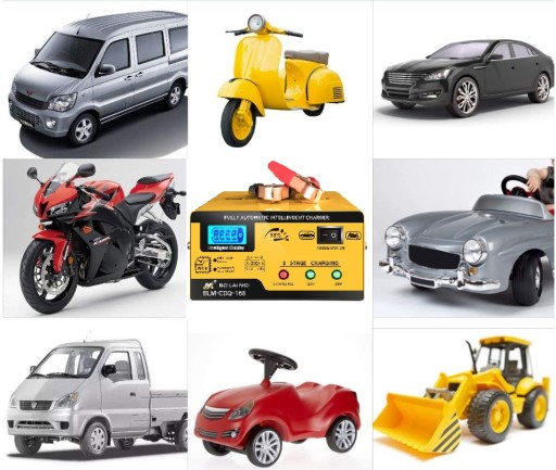 Nadaje się zarówno do akumulatorów 12 V, jak i 24 V, działa z SLA, WET, MF, FLOODED, GEL, VRLA, AGM, EFB, co oznacza, że może być stosowany do akumulatorów w samochodach, motocyklach, łodziach, kosiarkach, pojazdach rolniczych i innych.