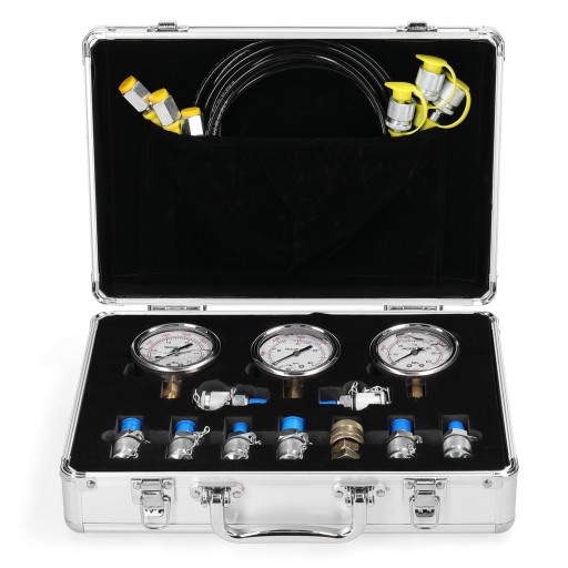 Praktyczny zestaw manometrów hydraulicznych do koparek maszyn budowlanych. Przesyłka obejmuje 3 x manometr, 3 x wąż testowy, 9 x złącze testowe.