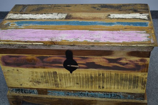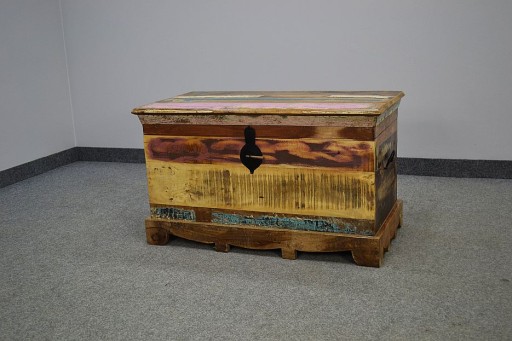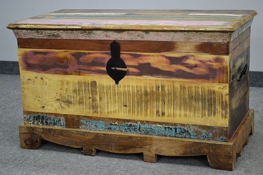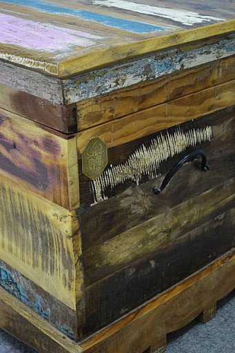 Efektowna skrzynia wyprodukowana w Indiach z drewna recyklingowego.