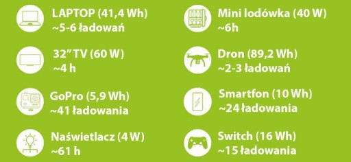- 1 x AC (230 V / 50 Hz), 3 x USB-QC 3.0, 1 x USB-PD i 2 x wyjście DC