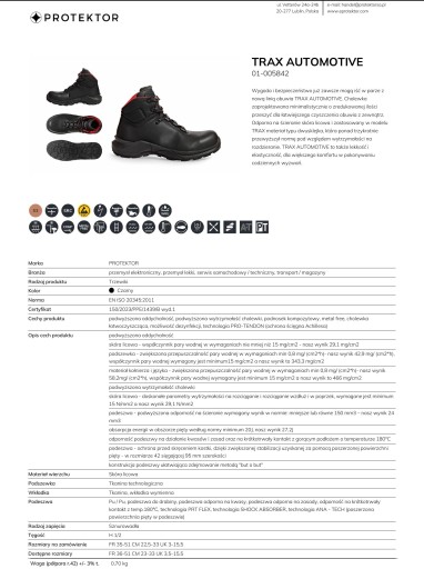 Wygoda i bezpieczeństwo już zawsze mogą iść w parze z nową linią obuwia TRAX AUTOMOTIVE. Cholewka zaprojektowana minimalistycznie o zredukowanej ilości przeszyć dla łatwiejszego czyszczenia obuwia z zewnątrz. Odporna na ścieranie skóra licowa i zastosowany w modelu TRAX materiał typu dwusklejka, która ponad trzykrotnie przewyższył normę pod względem wytrzymałości na rozdzieranie. TRAX AUTOMOTIVE to także lekkość i elastyczność, dla większego komfortu w pokonywaniu codziennych wyzwań.