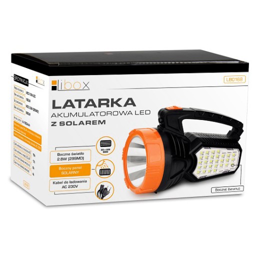 Latarka/szperacz LIBOX LB0168 , to latarka posiadająca oprócz przedniego reflektora boczne mocne światło i boczny panel solarny – dzięki któremu niezależnie gdzie jesteśmy możemy ładować swoją latarkę wprost ze słońca.