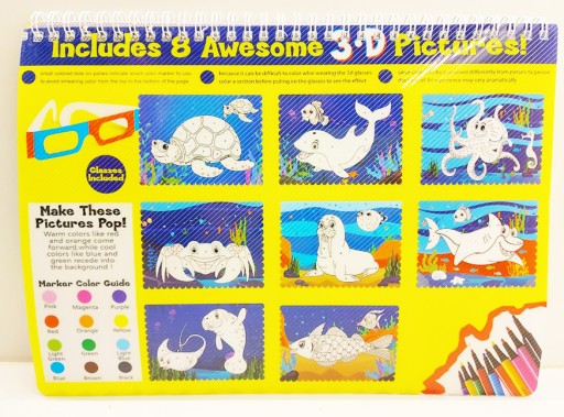 Zaskocz maluchy godzinami najfajniejszego tworzenia, dzięki temu imponującemu, specjalnemu notatnikowi pełnemu wzorów zwierząt podwodnych, gotowych do pokolorowania dołączonymi markerami. Najmłodsi mogą nadać zwierzakom pożądany wygląd, a następnie cieszyć się wspaniałym efektem 3D. Gdy zmyjesz kolorowankę wilgotną ściereczką, wówczas zabawa zaczyna się od nowa!