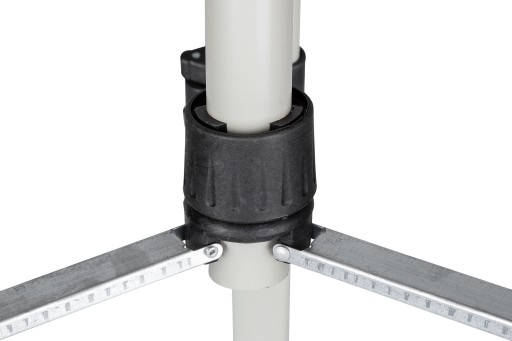 Wysokość centralnej kolumny możemy regulować za pomocą bocznej korbki i blokować na wymaganym poziomie, natomiast niewielka poziomica pozwoli odpowiednio ustawić cały statyw. Głowica o wymiarze 5/8" pozwala na zamocowanie większości dostępnych niwelatorów.