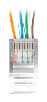 Pass Through (technologia przelotowa) upraszcza zarobienie końcówki, umożliwiając całkowite przeciągnięcie wszystkich żył przez wtyczkę. Pozwala to dokładnie sprawdzić czy przewody ułożone są w odpowiedniej kolejności. Zęby wtyku są pozłacane, przez co nie ulegają korozji i kontakt z przewodem jest lepszy. Wytrzymałe tworzywo sztuczne, z którego wykonane są wtyki nie odkształca się podczas zaciskania wtyków.