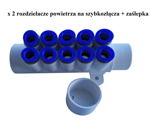 Rozdzielacz, kolektor, dystrybutor powietrza na szybkozłączki. Rozdzielacz ten służy do rozdzielania powietrza na dysze powietrza z pompy. Posiada zainstalowane już w środku szybkozłącza do których w prosty sposób wpina się wężyk o odpowiedniej średnicy, w tym wypadku powinien to być wężyk o średnicy zewnętrznej fi 8 mm.
