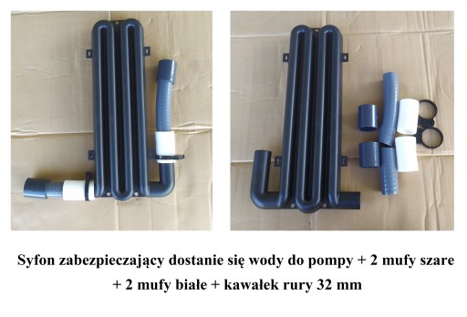 8. Syfon zabezpieczający dostanie się wody do pompy + 2 mufy szare + 2 mufy białe + kawałek rury 32 mm + 2 zaciski x 1 kpl