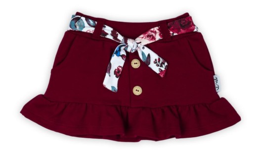 Spódniczka z falbanką u spodu wykonana z przyjemnej bawełny. Ozdobiona białym paseczkiem w czerwone kwiatuszki. Z przodu dwa guziczki dodające uroku. Ubranko ślicznie się układa i pasuje na każdą okazję.