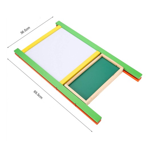 Tablica w postaci stojaka jest dwustronna. Jedna strona jest zielona do pisania kredą.