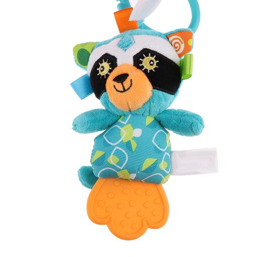 Miękkie ciało i głowa; pierścienie do gryzaków na szyi; kolorowe wstążki, sęki i krawaty tworzą nogi