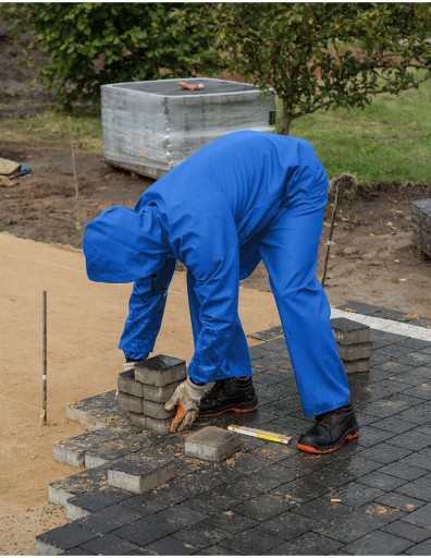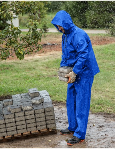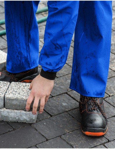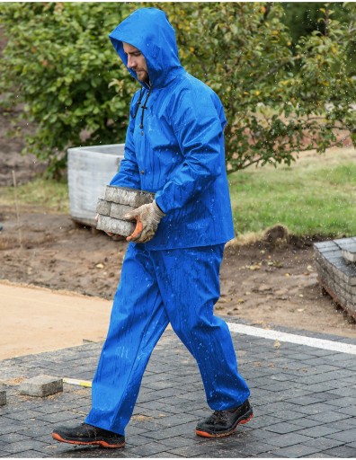 Ubranie złożone z kurtki z kapturem zapinanej na napy oraz spodni ogrodniczek z regulowanymi szelkami z elastyczną, szeroką gumą z tyłu. Model produkowany z wodoochronnej tkaniny Plavitex, przeznaczony do użytku w niesprzyjających warunkach pogodowych. Zapewnia skuteczną ochronę przed wiatrem i deszczem. Wodoochronna powłoka zapobiega przenikaniu wilgoci. Technika obustronnego zgrzewania zwiększa wytrzymałość szwów. Produkt spełnia standardy europejskich norm: EN ISO 13688 i EN 343.