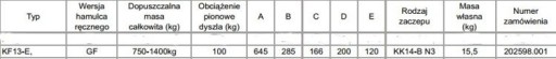 Przedmiotem sprzedaży jest nowe oryginalne urządzenie najazdowe KF13 renomowanej firmy KNOTT. Urządzenie przeznaczone jest do przyczep z dyszlem typu „V”. Hamulec posiada zaczep typu KK14B ze średnicą na hak 50 mm. Dopuszczalna masa całkowita przyczepy dla hamulca wynosi 750 – 1400 kg.