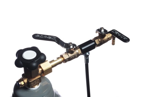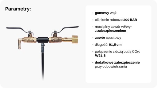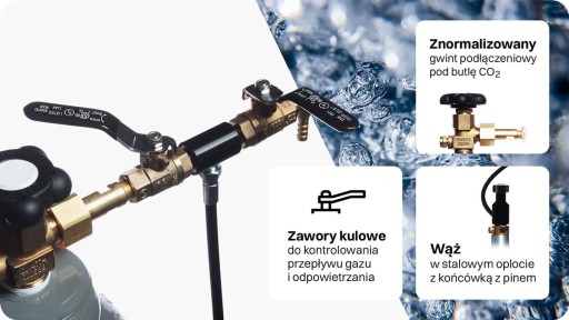 Zawór kulowy pozwalające kontrolować przepływ dwutlenku węgla oraz odpowietrzający układ.