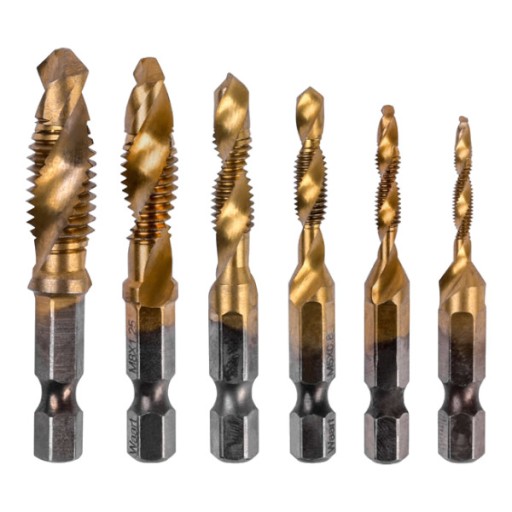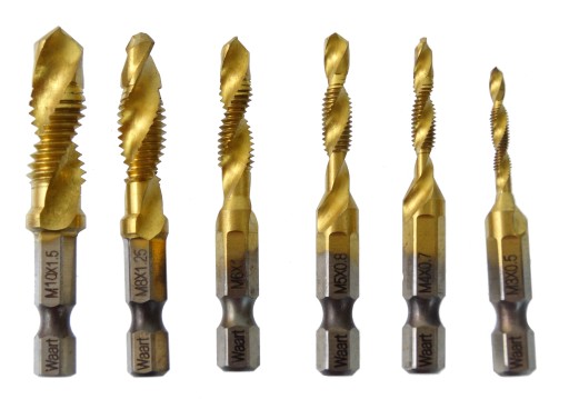 Solidny zestaw wierteł gwintujących wykonanych ze stali szybkotnącej HSS. Wyposażone w sześciokątny uchwyt typu quick change HEX. Są to gwintowniki z funkcją wiercenia - mogą służyć jednocześnie do wiercenia otworu i nacinania nowych gwintów, które zapewniają płynne gwintowanie.