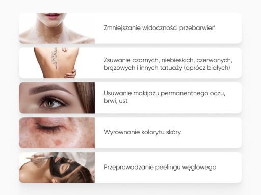 - Jest stosowany do rozwiązywania szerokiego zakresu problemów estetycznych: usuwania tatuaży, przebarwień, piegów, a także fotoodmładzania i rozjaśniania skóry.