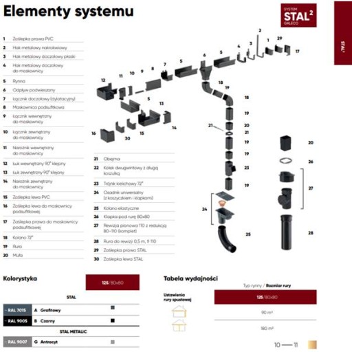 Dopasowany do systemu GALECO STAL, kolor osadnika jest zbliżony do koloru RAL 7015 GRAFITOWY ( A ) w. g. kolorystyki producenta.