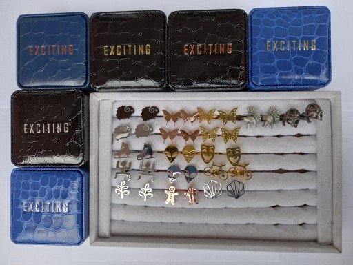 - Zestaw spinek jest zapakowany w ekskluzywne etui o wymiarach 7 x 7 x 4 cm z wzorem wężowej skórki oraz białą satynową wyściółką wewnątrz.